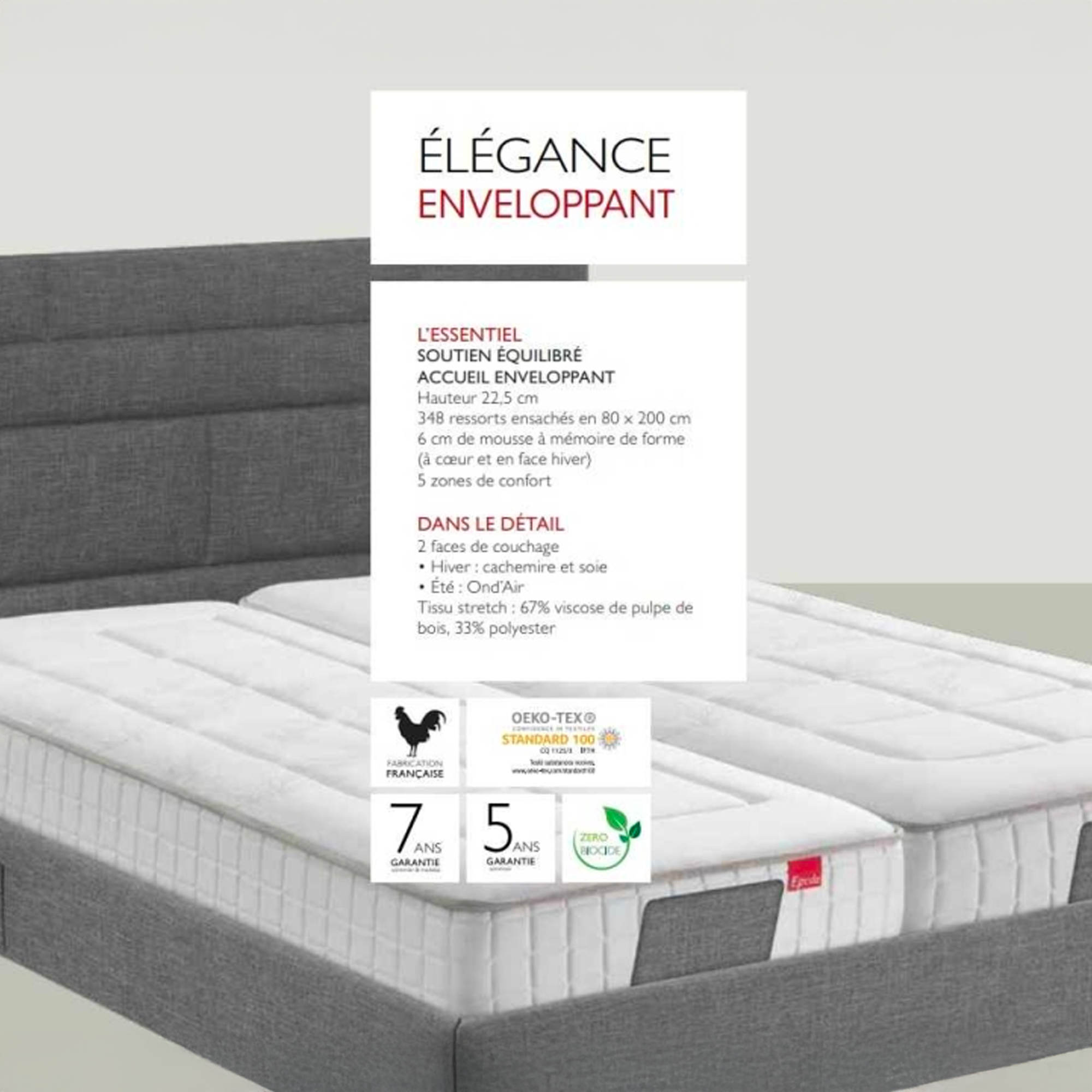 Le matelas ÉLÉGANCE ENVELOPPANT vous offre un accueil enveloppant grâce à la double couche de mousse à mémoire de forme (6 cm répartis à cœur et en face hiver). La technologie ressorts ensachés apporte un soutien précis du corps et une aération optimale. Ses matières nobles, que sont la soie naturelle et le cachemire, apportent isolation et respirabilité à votre literie.