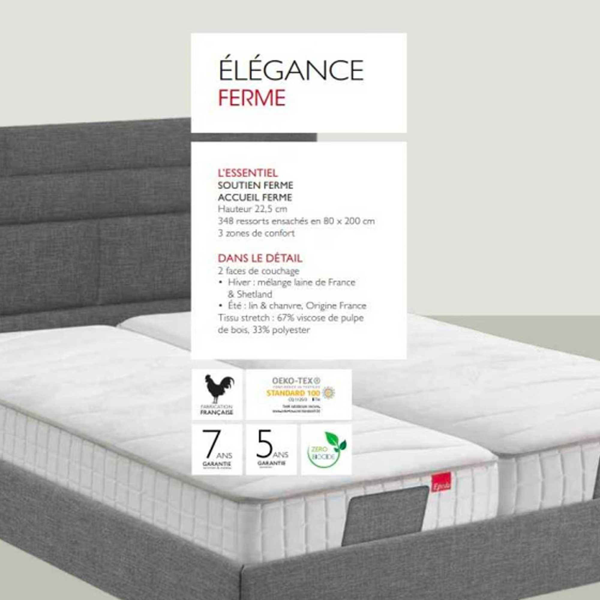 Le matelas ÉLÉGANCE FERME vous procure un accueil et un soutien ferme. La technologie ressorts ensachés apporte un soutien précis du corps et une aération optimale. Deux faces de couchage avec de la laine shetland en face hiver qui apporte du moelleux, et en face été, du lin et chanvre – Origine France – qui favorisent la fraîcheur en été.