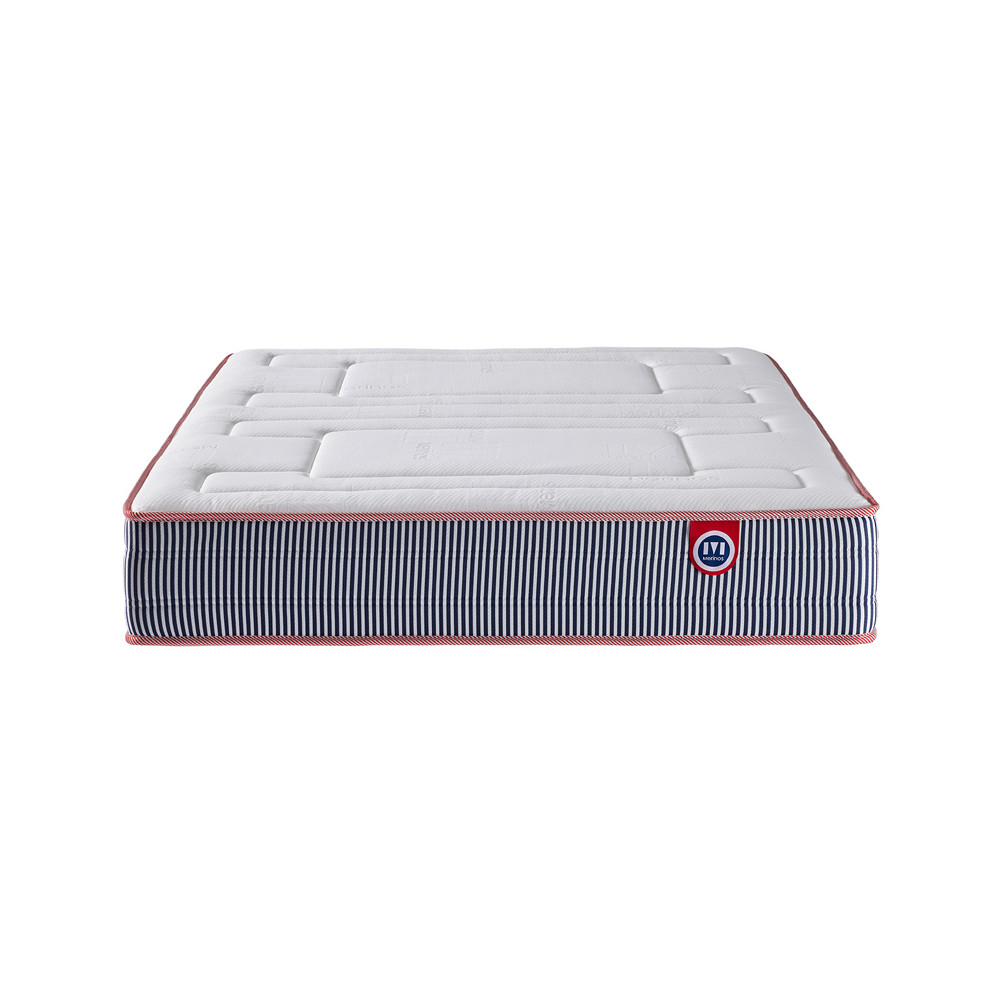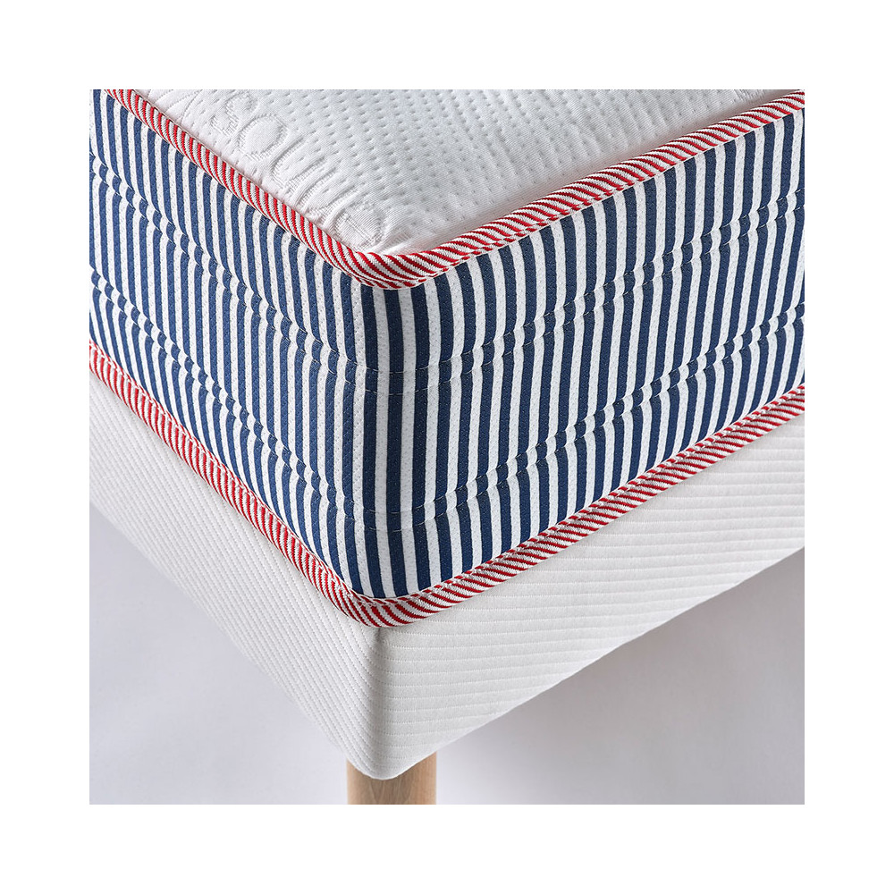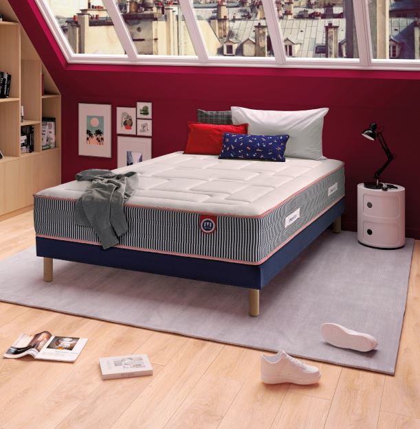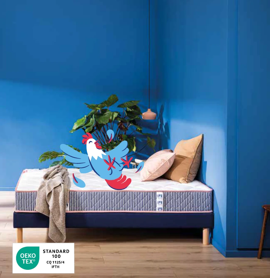 Cette année, nous fabriquons 100 % de nos ressorts à Vesoul. Ouate et feutre sont 100 % recyclés, 90 % de notre acier l’est aussi. Avec ses rayures tricolores et son design joyeux, nos matelas la portent haut, cette fierté du made in France.