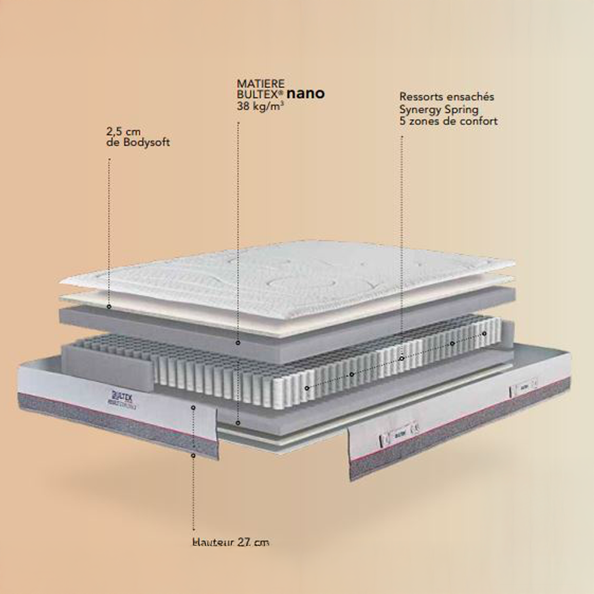 Grâce à l’association des matériaux BULTEX® nano et des ressorts ensachés, le matelas s’adapte progressivement à votre corps, offrant un soutien en temps réel et un maintien parfaitement dosé. Cette réactivité permet une continuité du sommeil et une récupération dynamique tout au long de la nuit.