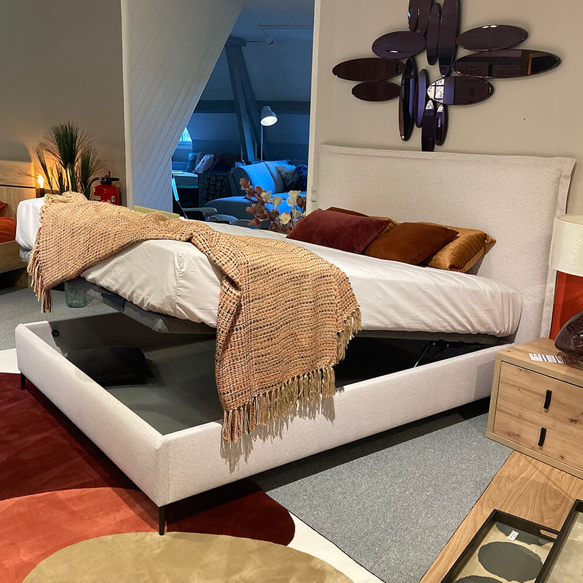 Le lit coffre est une literie dotée d’une structure en acier qui cache un coffre s’ouvrant verticalement ou horizontalement et pouvant s’incliner sur un angle de 70 degrés. Il permet de profiter d’un volume de rangement en toute discrétion en dessous